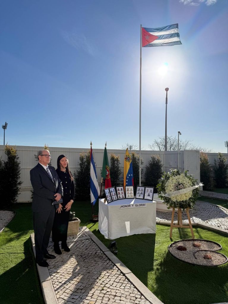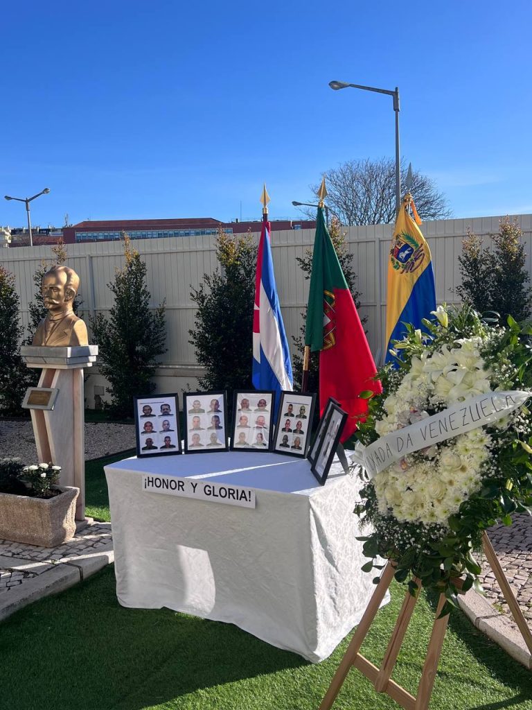 Lisboa, 19 de enero de 2026.- La Embajada de la República Bolivariana de Venezuela en Portugal realizó este lunes una ceremonia de ofrenda floral ante el busto de José Martí, ubicado en la Embajada de la República de Cuba en Lisboa, para honrar a los 32 hermanos cubanos que perdieron la vida durante la agresión militar de Estados Unidos (EEUU) contra el país suramericano, ocurrida en la madrugada del pasado 3 de enero.